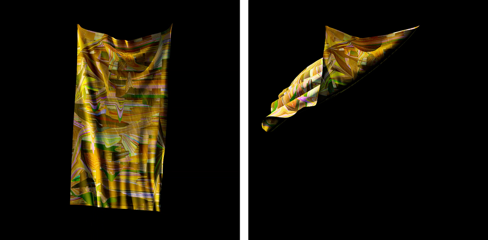 The glitched images spawned the animation "Comestiblemealplan-Weave". The glitched images were compiled into one checkered file, and using 3D animation software, the file took the form of a drapery that seemingly blows in the wind. The animation embodies flexibility and adaptability, while remaining anchored and returning to center.